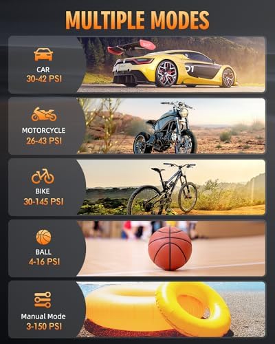 【4+N Smart Mode】The portable air compressor has four types of pressure measurement units: PSI, KPA, BAR, and KG/CM ²; four preset inflation modes: bicycle, motorcycle, car, and ball. The fifth manual mode can also set the pressure value based on the inflation object to meet various inflation needs. It facilitates daily life and travel.