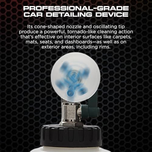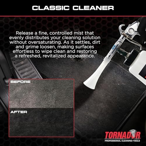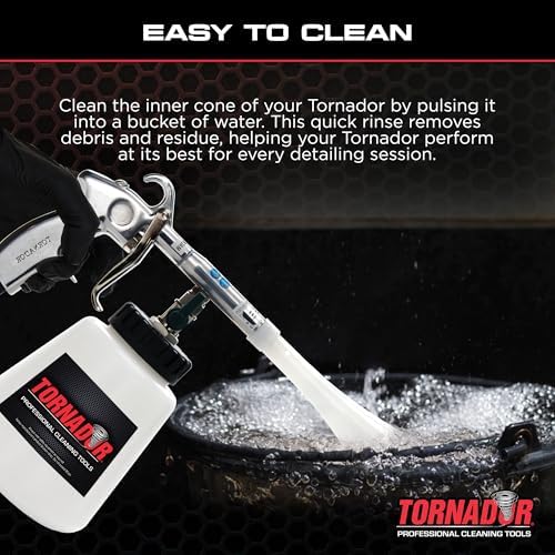 Tornador car cleaning tools are the fastest and easiest way to clean all automotive surfaces; Cleans and air dries in seconds; Tested and approved by industry pros;|Works with your air compressor to blast cleaning solution into crevices you can’t reach by hand|Clean carpet plastics and upholstery inside the car; Clean wheels convertible tops and body seams on the exterior;|Low wear and maintenance; Heavy-duty construction; Low noise emissions;|The Tornador Cleaning Tool cleans where other tools can’t
