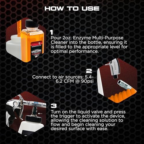 Works with your air compressor to blast cleaning solution into crevices you can’t reach by hand